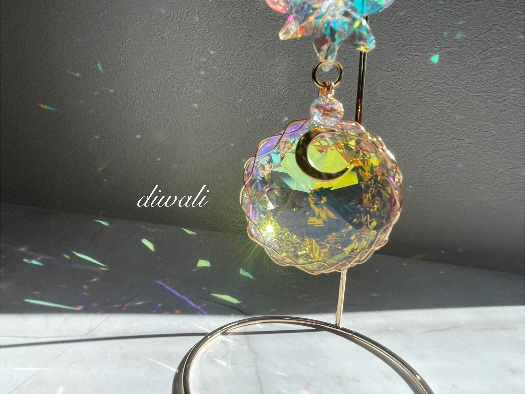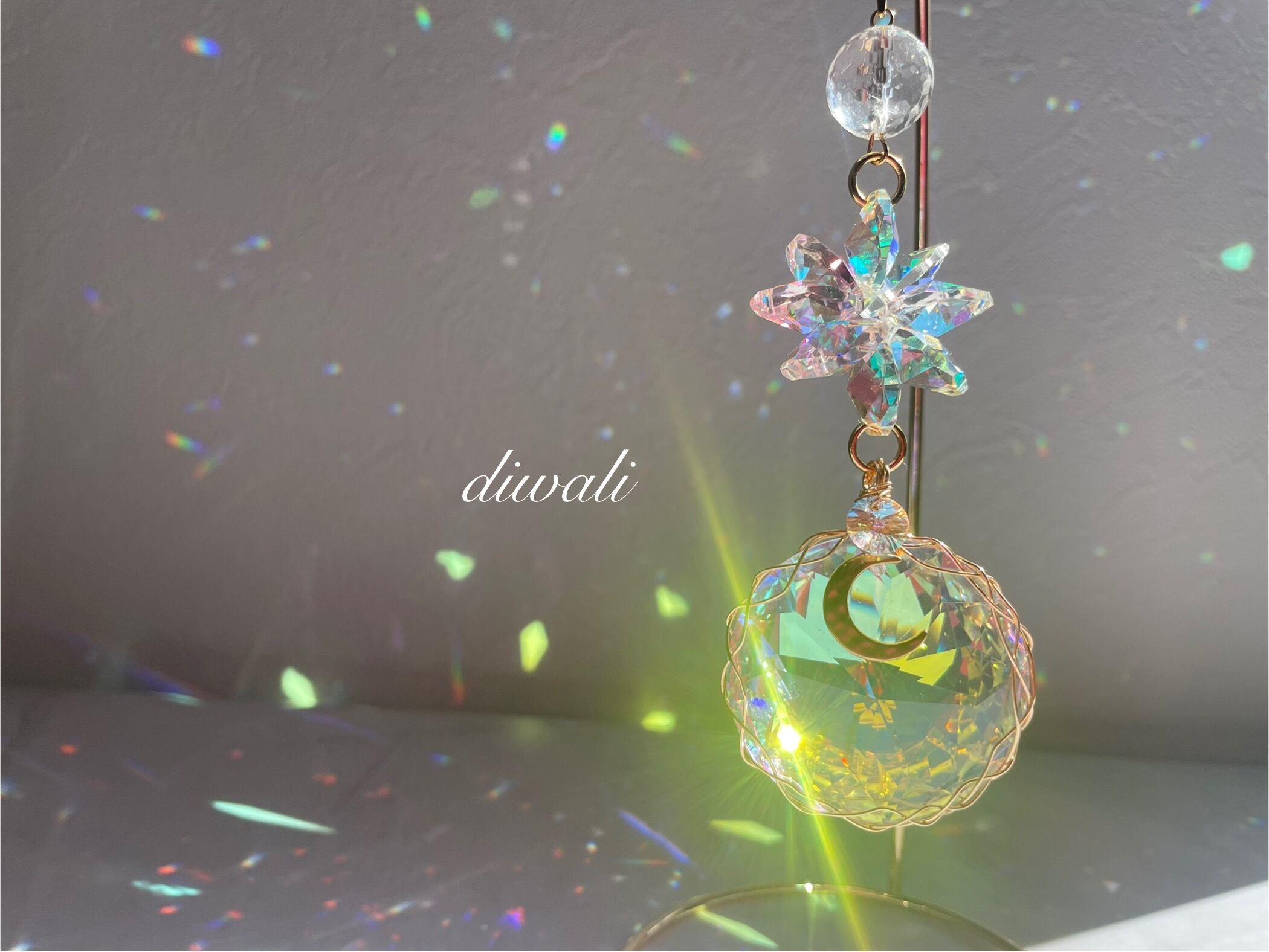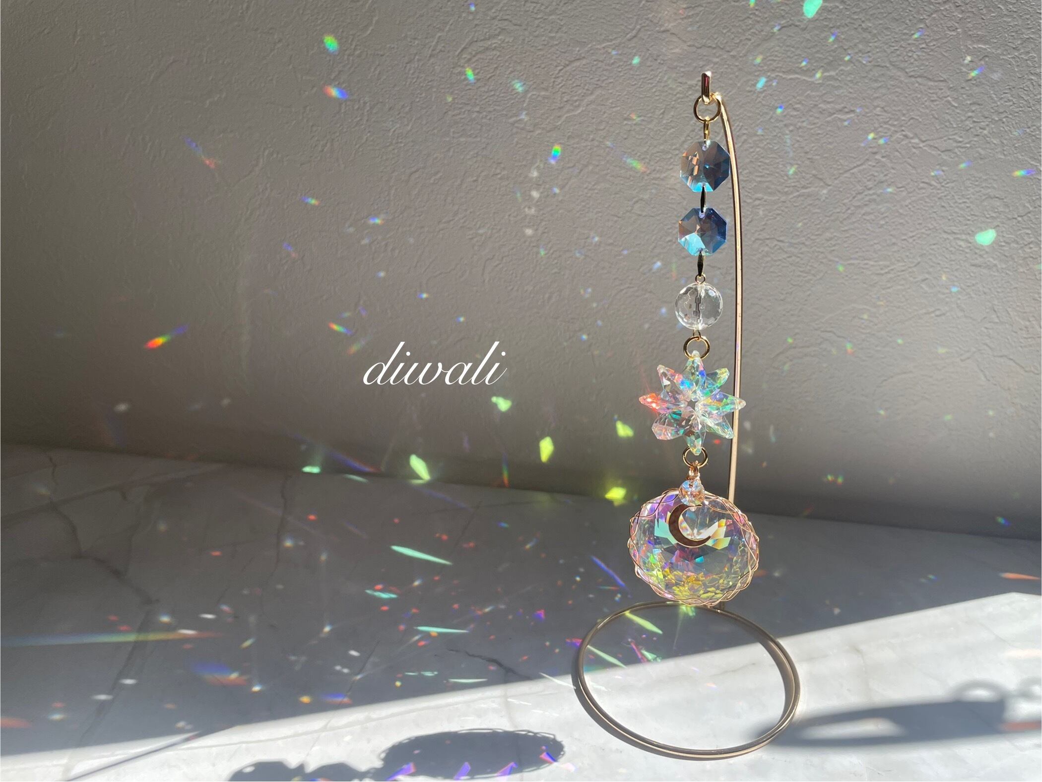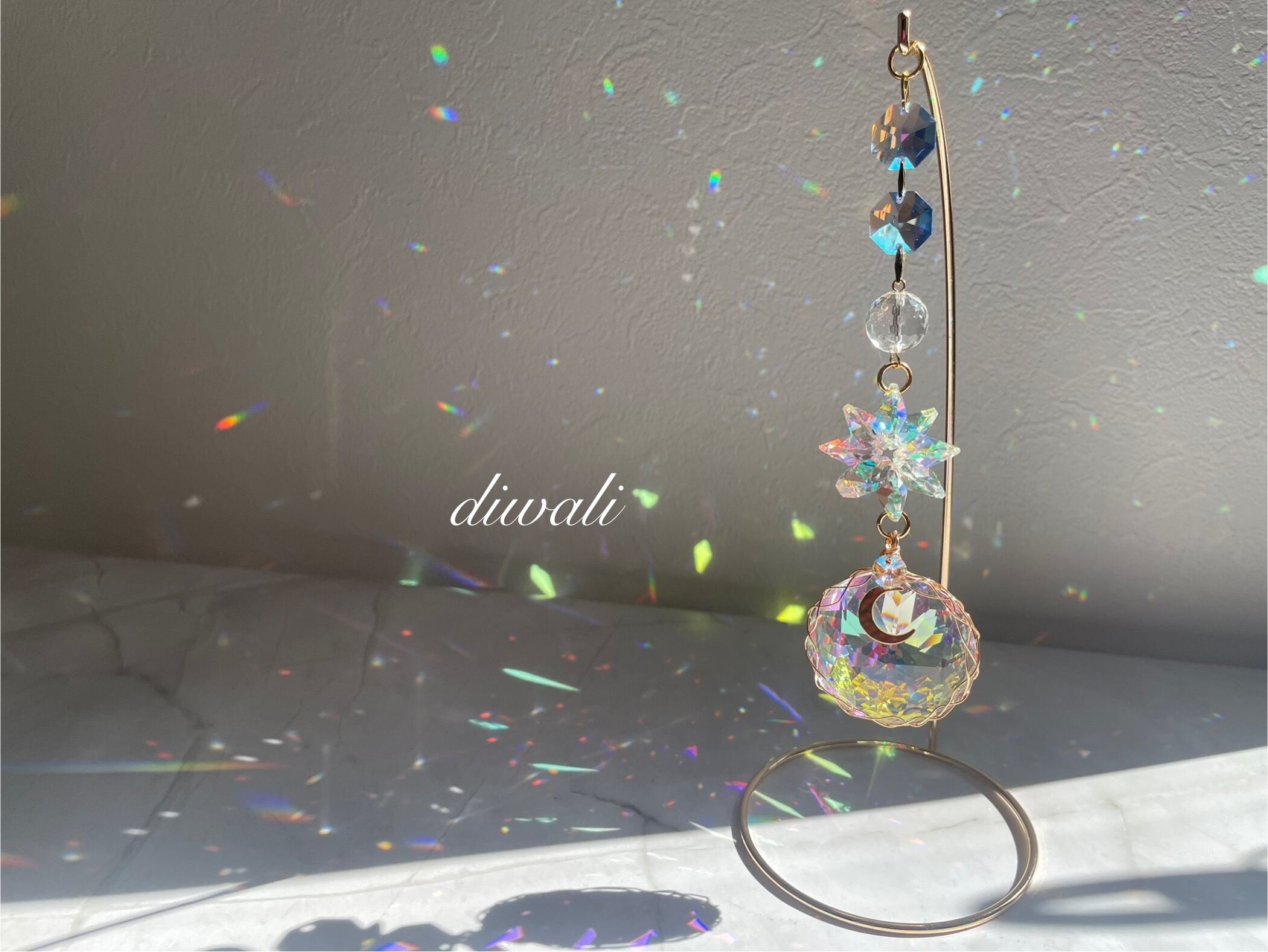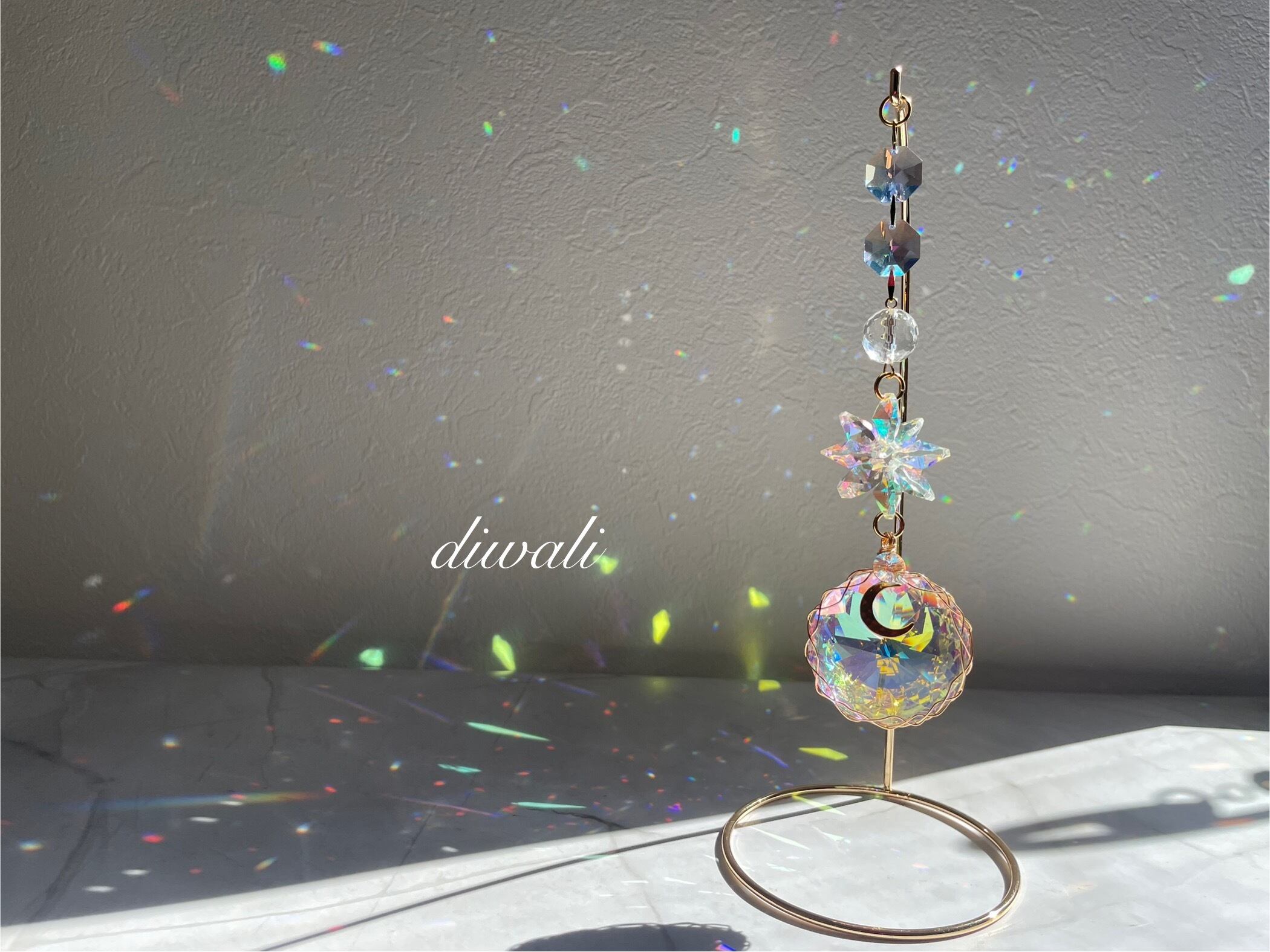 柔らかな光を受けて、色々な色が部屋中に散りばめられた美しい虹が、空間に癒しのエネルギーを届けてくれます。